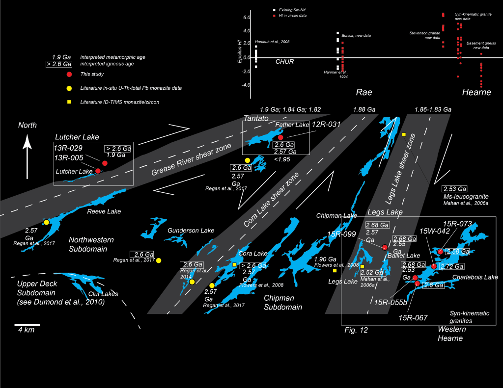 Existing geochronology and sample locations for paired U-Th-Pb and Hf analyses in zircon showing no major changes across the Snowbird Tectonic Zone with respect to 2.60 Ga plutonic rocks. These data demonstrate that the Rae and Hearne domains were likely together at 2.60 Ga.